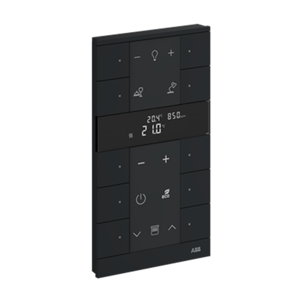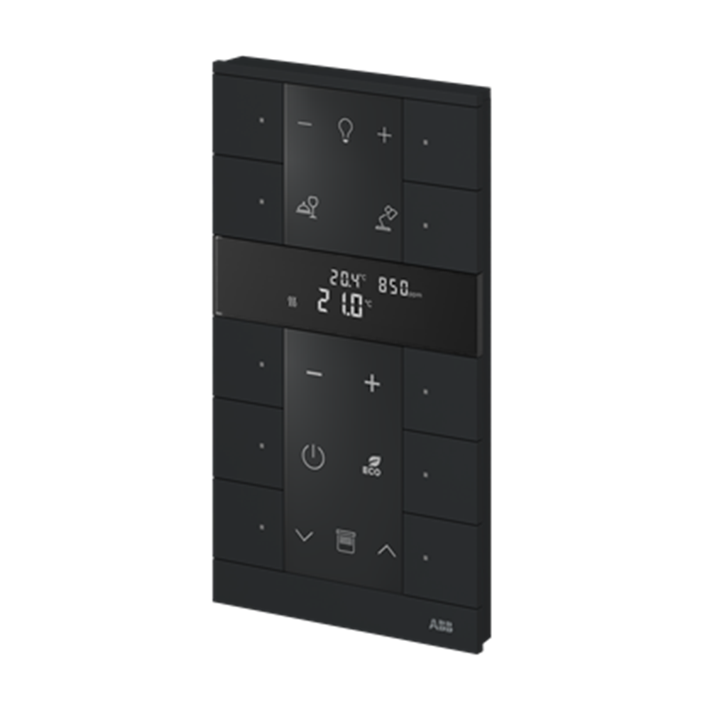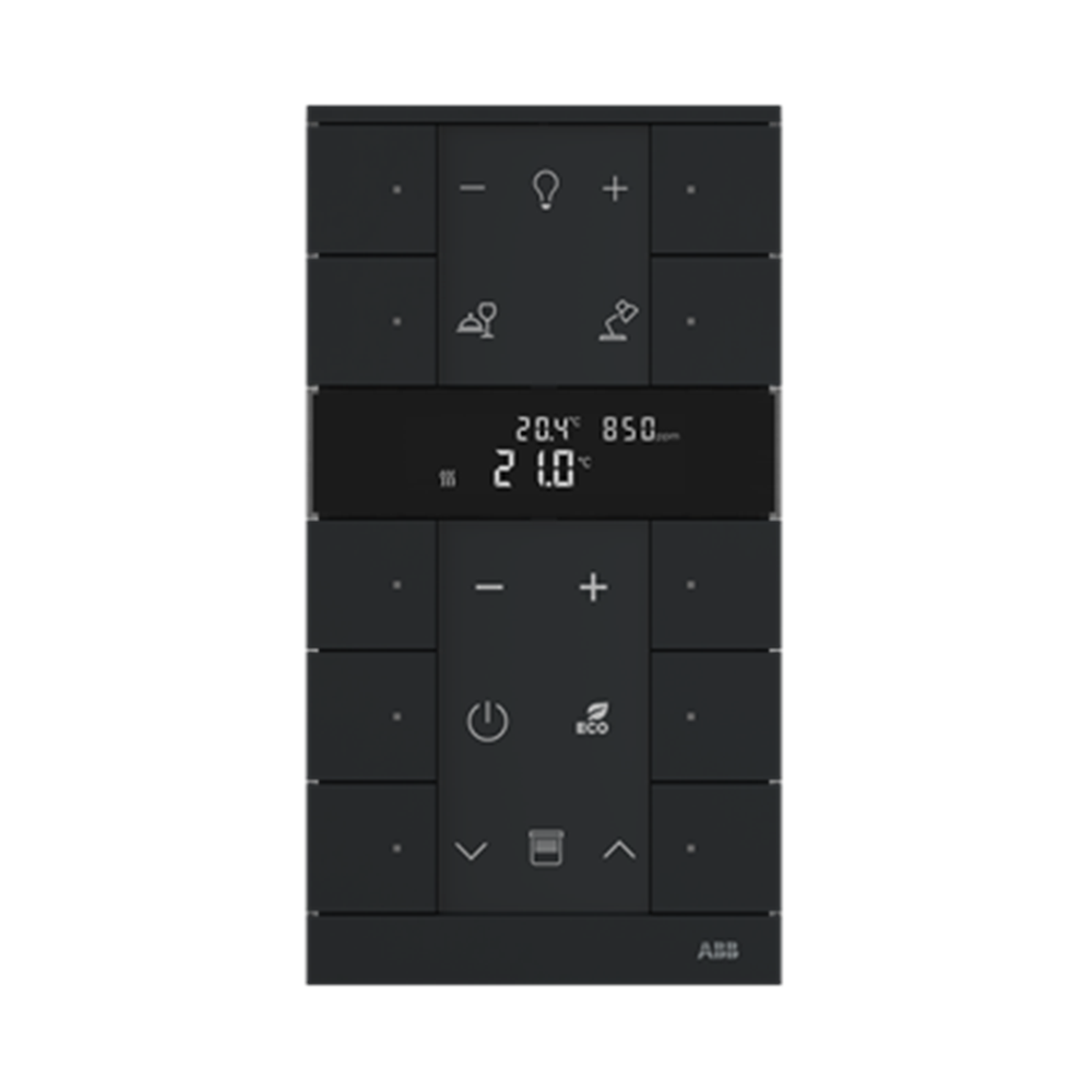 Control element with room temperature controller function and CO2/VOC/moisture sensor. For controlling commercially available actuating drives in combination with free@home Heating-/Fan-Coil Actuators. With display of set-value and current temperature. For transmitting switching, push-button, dimming and blind commands to an ABB-free@home® actuator. With integrated bus coupler. With labelling field. Number of bus subscribers: 2