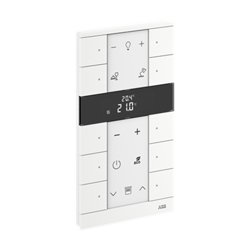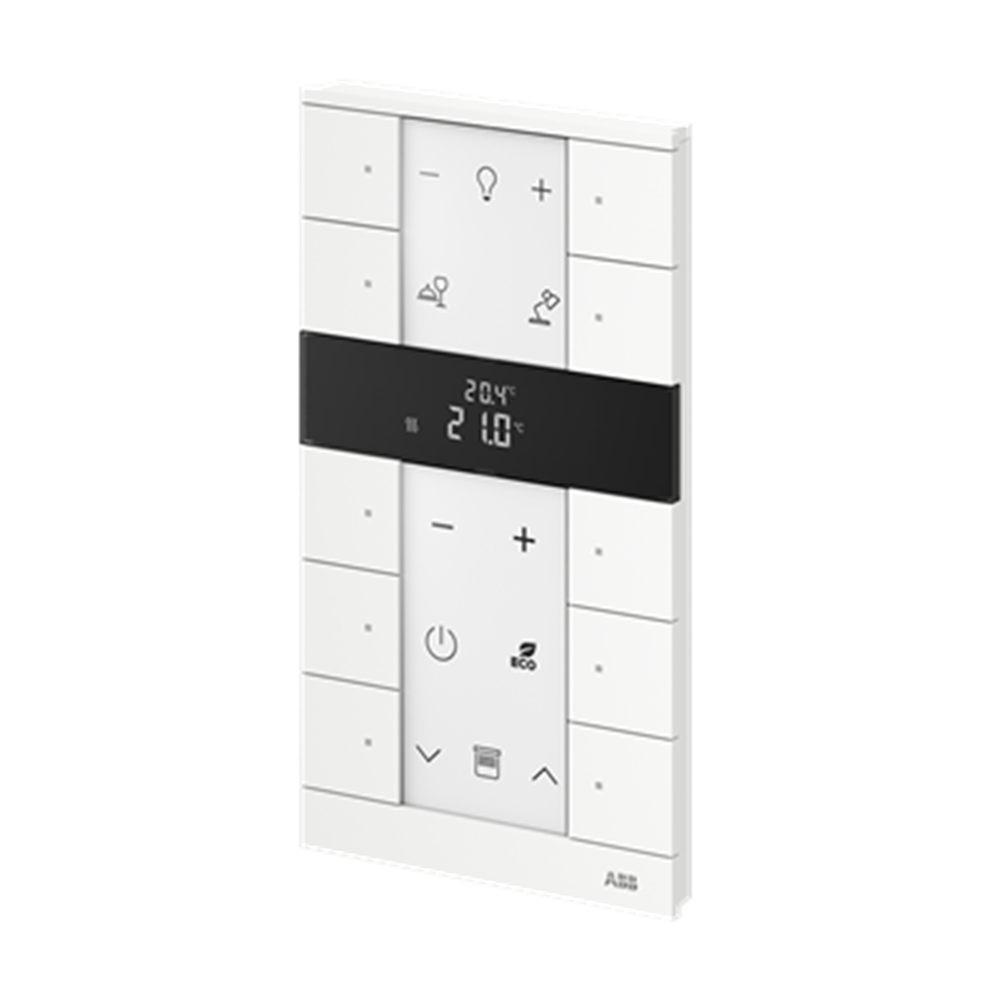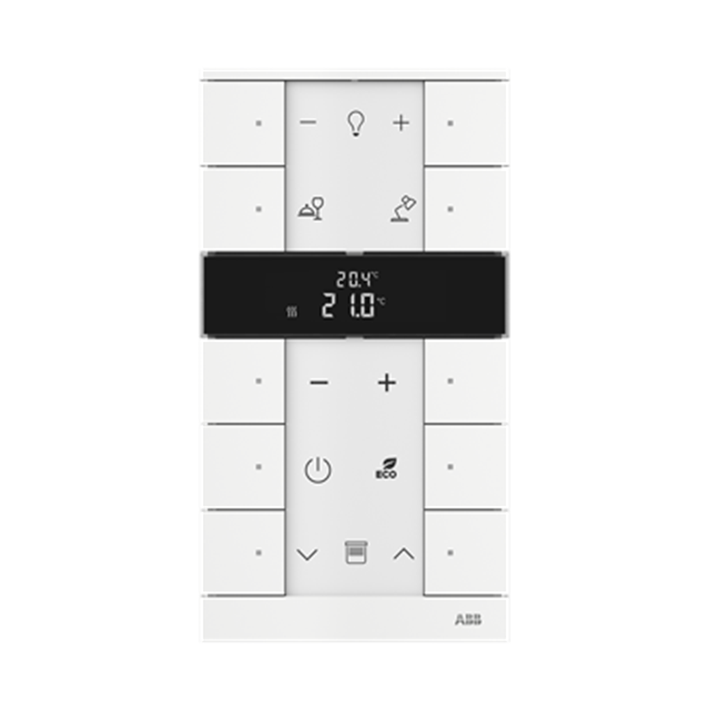 Control element with room temperature controller function. For controlling commercially available actuating drives in combination with free@home Heating-/Fan-Coil Actuators. With display of set-value and current temperature. For transmitting switching, push-button, dimming and blind commands to an ABB-free@home® actuator. With integrated bus coupler. With labelling field. Number of bus subscribers: 1
