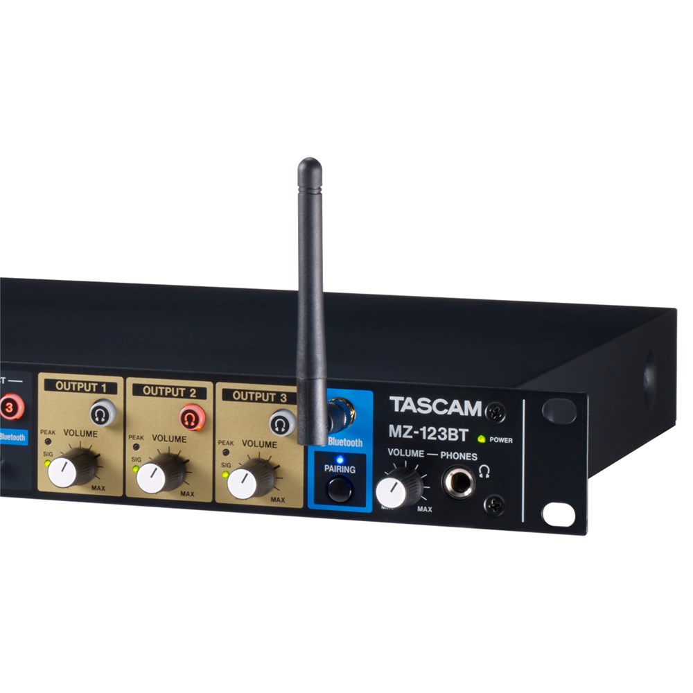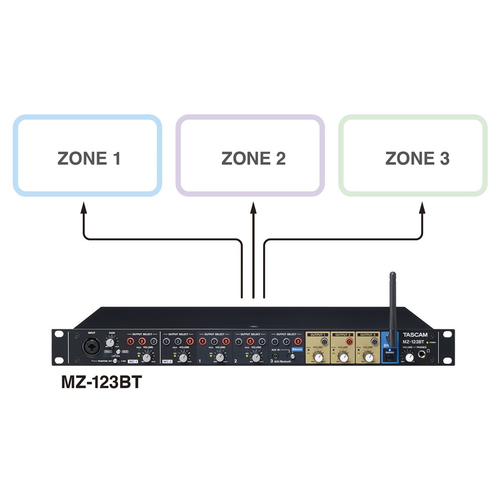The TASCAM MZ-123BT is a compact 1U multi-channel, multi-zone professional installation mixer that provides versatile routing, mixing and distribution of up to three channels of music and announcements for a wide range of commercial applications, including retail, restaurants, bars, cafes, hotels, or any environment that requires independent audio routing and announcement capabilities. Featuring a simple, intuitive layout for ease of operation, the Bluetooth®-enabled MZ-123BT comes equipped with 2 versatile mic inputs and automatic attenuation of background music for superior intelligibility during announcements or paging.
