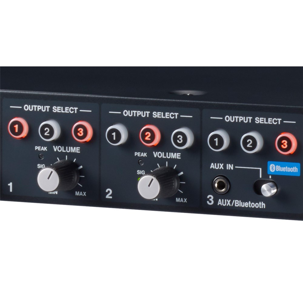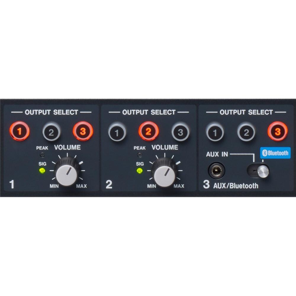 Stereo LINE Inputs 1 and 2 (RCA, Unbalanced) allow connection of AV equipment such as TASCAM CD/Solid State Players or similar playback devices. The Channel 3 AUX/Bluetooth® Input allows an additional audio source to be connected via Bluetooth® or 3.5mm mini plug. Each input features a Volume Control knob as well as a Zone Routing button (1, 2 or 3) for audio distribution to desired areas.