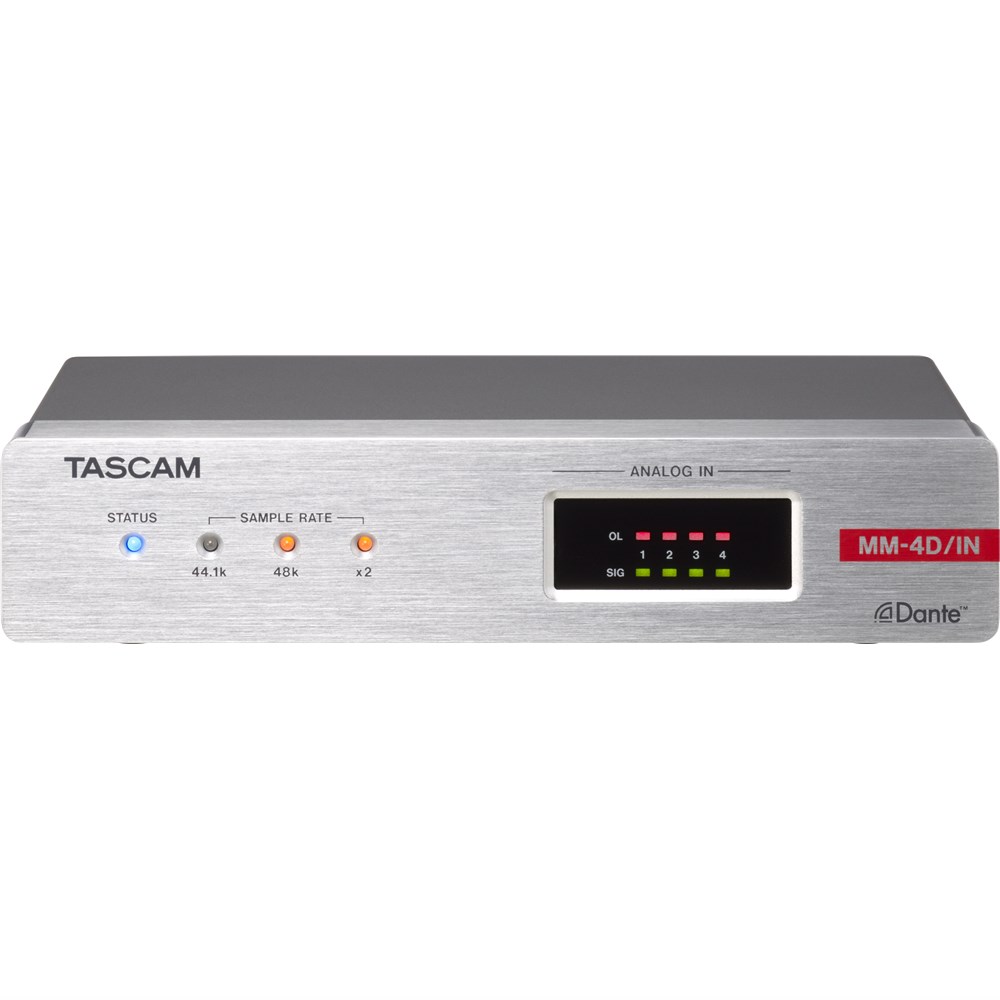 The MM-4D/IN-X is a compact converter that converts 4-channel mic/line input signals into Dante signals. With half the size of a standard 1U rack, the MM-4D/IN-X is suitable for different Dante systems as an exquisite analog output unit. The built-in DSP mixer enables small scale systems to fully perform with a variety of input/output models the TASCAM Dante Compact Processor Series offers. MM-4D/IN-X supports up to 96kHz/24bit and uses XLR connectors for analog mic/line input.