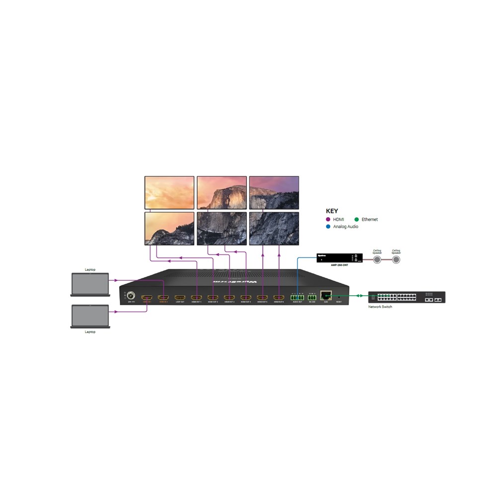 6x HDMI OUT: 19-pin type A1x 5-pin Phoenix Analog Audio with balance (de-embed from selected HDMI input)