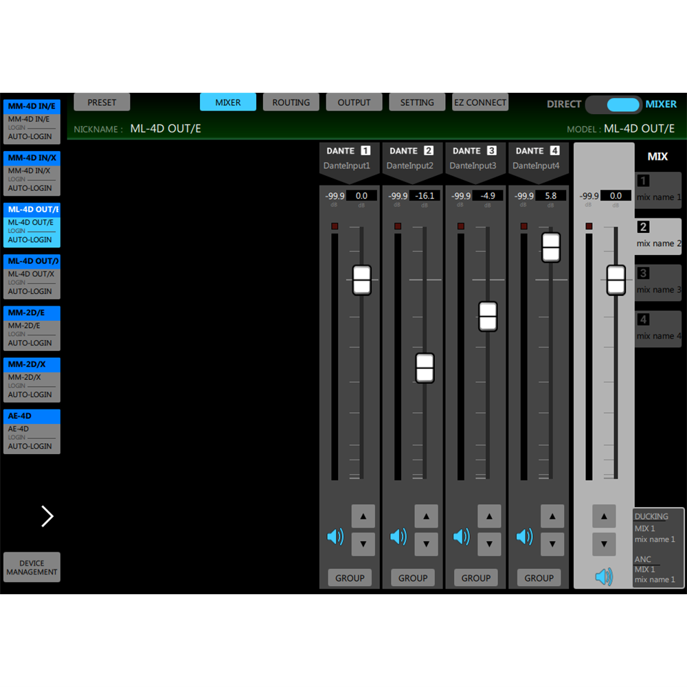 Using the built-in matrix mixer, users can mix 4-channel Dante inputs and configure settings on each of the four output zones. The matrix mixer is also equipped with a ducking function and an ambient noise compensator function, which detects the level of environmental sounds and automatically adjusts the input level of the source.
