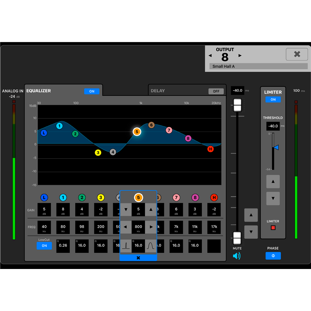 10 band EQ, high pass filter, low pass filter, delay, and limiter effects included. They can be finely adjusted depending on the powered speakers, or to the environment in which the unit is used.