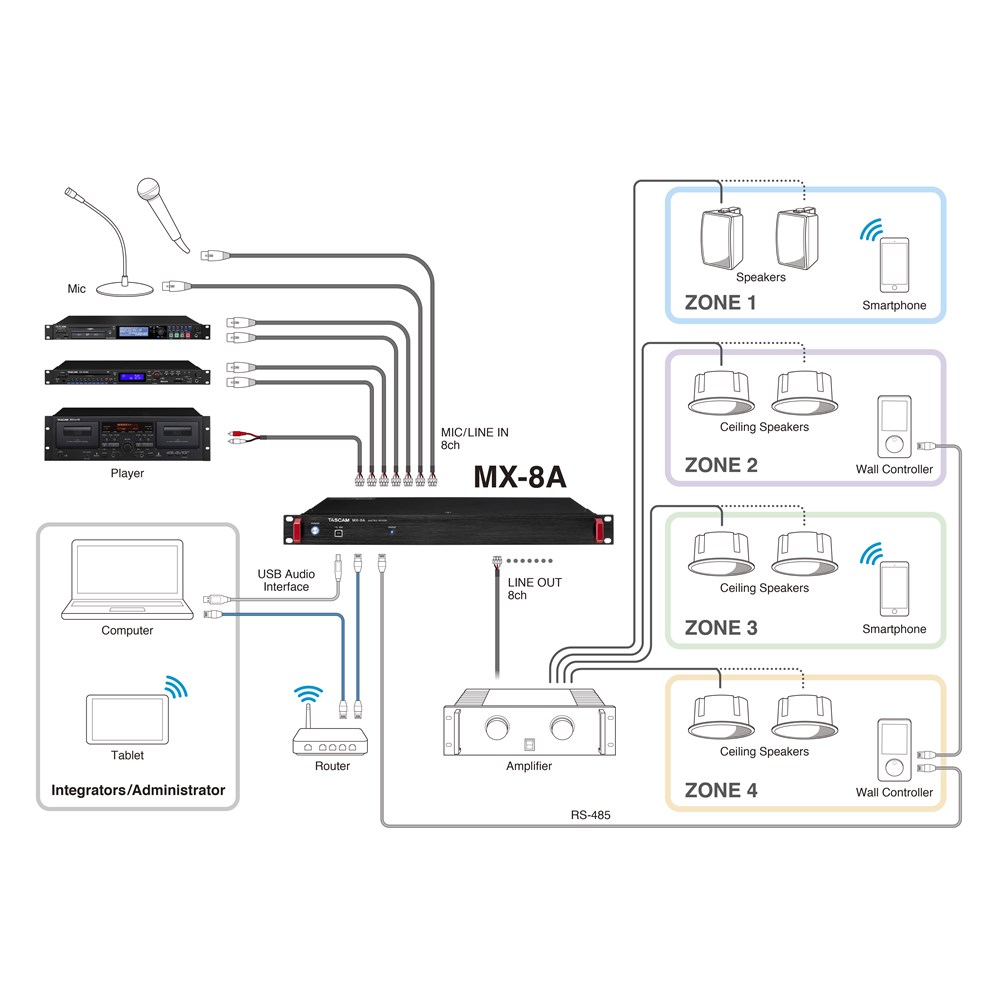 ■ Features 8-channel Mic/Line input with phantom power (+48v) support Supports remote mic gain control 8 line output Analog input / output adopting Euro block terminal suitable for Contractor Built-in a variety of DSP functions for optimal use in different scenes/environments Remote control via Ethernet 2 types of user control software available for Windows/Mac/iOS/Android devices TASCAM MX CONNECT (For Integrator) Designed for integrators that handle the configuration and settings of an entire system Routing selection, DSP/design/scene settings of the complete system, etc. TASCAM EZ CONNECT (For end users) Designed for end-users and allowing them to use simple controls Simple app design for only the necessary functions such as area volume settings, etc. Flexible scene preset function allows to work in different area situations (Up to 50 presets) Timer event function allows to automatically switch scenes at a specified time (Planned to be compatible on a future version update) 2 in / 2 out USB audio interface(Enable playback and recording of external software (WMP, iTunes, DAW) by connecting with computer, tablet and smartphone) Equipped with RS-232C serial terminal for external control, you can have a flexible system 1U mountable size Optional product Wall mount controller* that can adjust the volume etc. via RS-485.(Planned to be released in the future) ■ SpecificationsGeneralFORMAT 44.1k/48kHz, 16bit/24bitInput/output ratingsUSB port 4-pin USB B-typeTransfer rate USB 2.0 High Speed (480 Mbps)ANALOG IN connectors Euroblock (balanced) 3.81mm pitchMinimum input level −70 dBuMaximum input level +26 dBuInput impedance 2.2 kΩ or higherANALOG OUT connectors Euroblock (balanced) 3.81mm pitchNominal output level +4dBu (when Ref.Level set to other than -9dBFS), +6dBu (when Ref.Level set to -9dBFS)Maximum output level (switchable) +15dBu (Ref.Level: -9dBFS), +18dBu (Ref.Level: -14dBFS), +20dBu (Ref.Level: -16dBFS)+22dBu (Ref.Level: -18dBFS), +24dBu (Ref.Level: -20dBFS)Output impedance 200 Ω or lowerRS-232C connector D-sub 9-pin (female, inch-standard)RS-485 connector RJ-45Cables Category 5e or faster STP cablesEthernet connector RJ-45Transmission protocol TCP/IPEthernet standard 100BASE-TXCables Category 5e or faster STP cablesNote: 0dBu=0.775VrmsAudio performanceMic amp EIN (equivalent input noise) -126 dBu or less (MIC IN → LINE OUT, Input impedance: 150 Ω, 22 kHz LPF, A-weighted, JEITA)Frequency response ±0.5 dB: 20 Hz – 20 kHz(+24 dBu input, MIC IN → LINE OUT, GAIN MIN, JEITA)Distortion (THD+N) 0.005 % or less(+24 dBu input, 1 kHz, MIC IN → LINE OUT, GAIN MIN, JEITA)S/N ratio 106 dB or higher(+24 dBu input, 44.1 k/48 kHz sampling frequency, MIC IN → LINE OUT, GAIN MIN, JEITA)Crosstalk 106 dB or higher(+24 dBu input, 1 kHz, MIC IN → LINE OUT, GAIN MIN, JEITA)Dynamic range 106 dB or higher(MIC IN → LINE OUT, GAIN MIN, JEITA)Note: JEITA indicates compliance with JEITA CP-2150Supported audio driversWindows UAC2.0, WDMmacOS/iOS UAC2.0Android UAC2.0OtherPower AC100-240 V, 50/60 HzPower consumption 21WDimensions 483 x 45 x 304.1mm (W x H x D, including protrusions)Weight 3.0kgOperating temperature range 0°C–40°CIncluded items Power cord x 1, Euroblock plug x 16, Cable band kit x 1, Rackmount screw kit x 1, Owner's Manual (including warranty) x 1