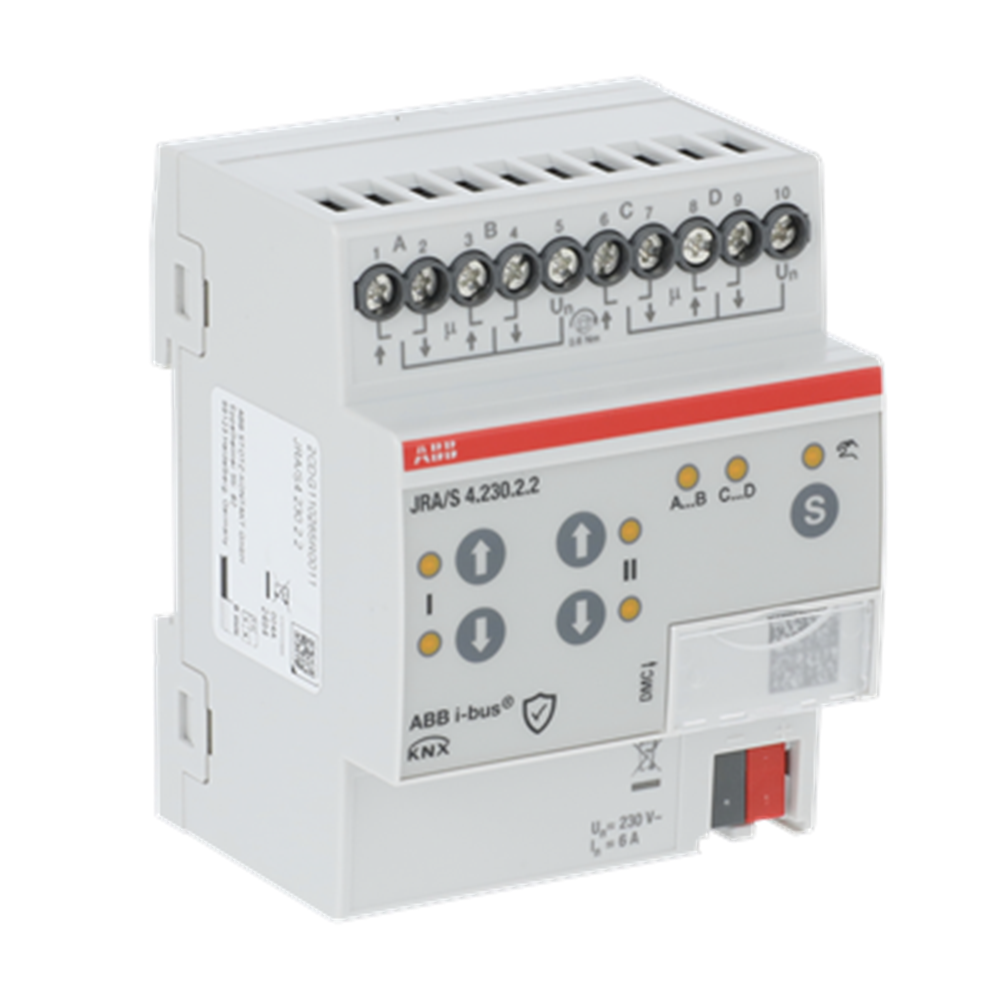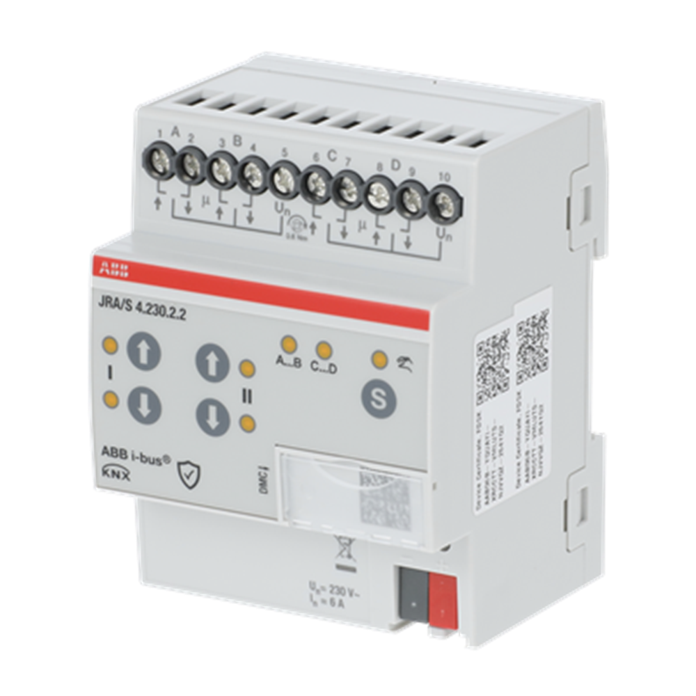 For the control of independent 230 V AC motors via ABB i-bus® KNX. The devices are designed for positioning blinds, roller shutters, awnings and other shading products as well as for controlling doors, windows and ventilation flaps. Additional auxiliary voltage is not needed. To protect the motor, the output contacts are electromechanically locked against each other. Push-buttons are located at the front of the device to control the outputs e.g., during commissioning. The current status of the output is displayed via LEDs if the output is selected.