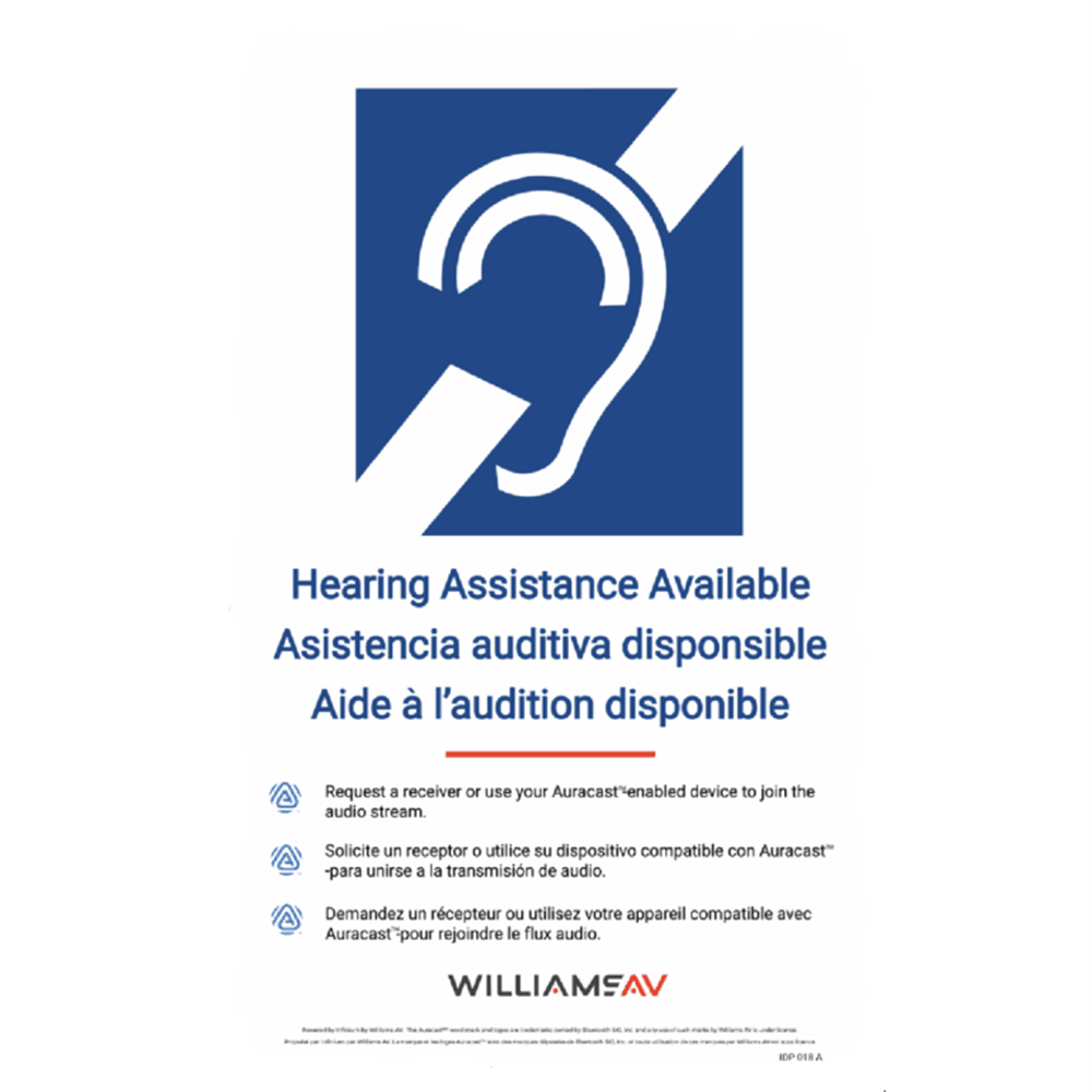 Let your customers know that an ADA-compliant hearing assistance system is available to them with a Hearing Assistance Available sign. This sign also contains a reference to an Auracast signal.