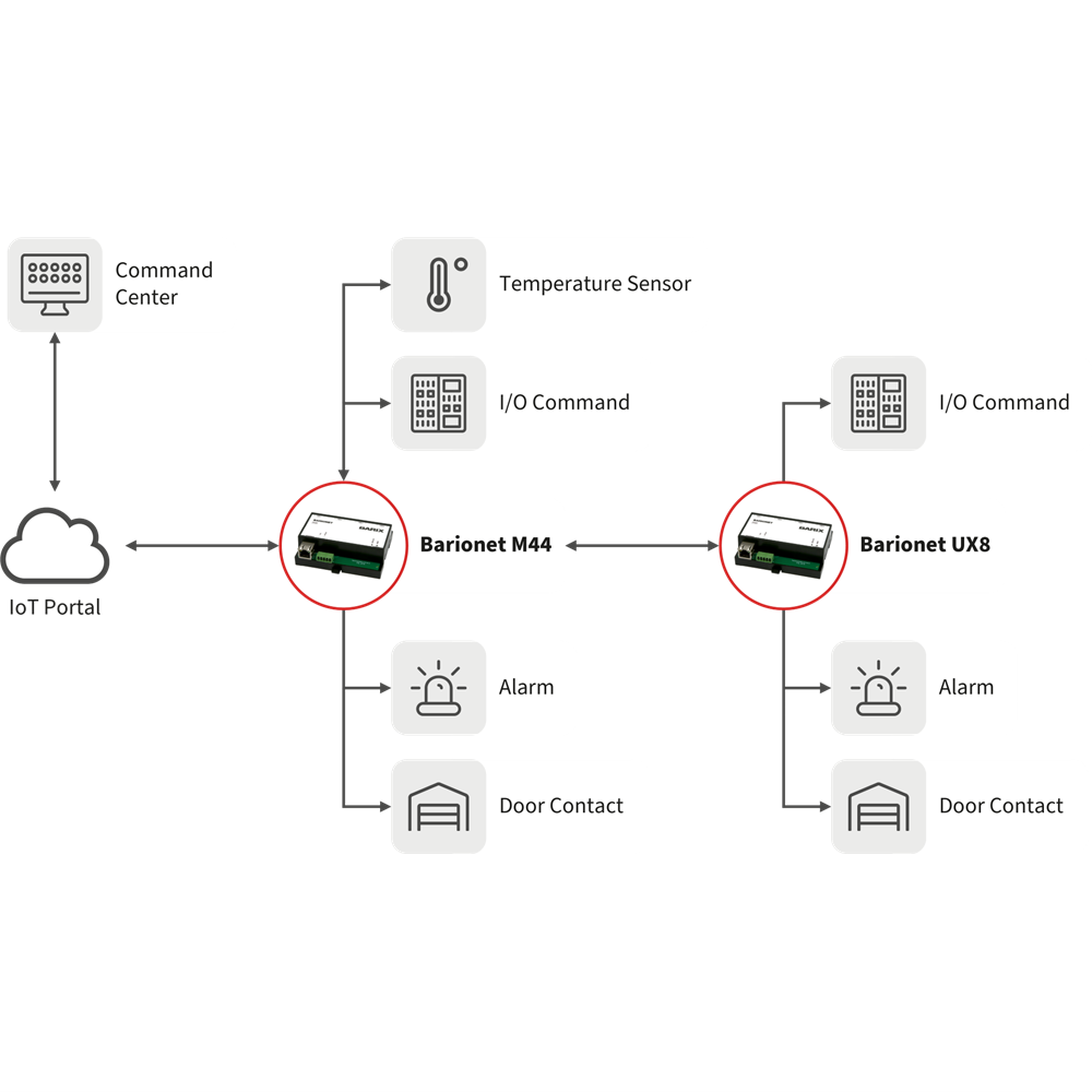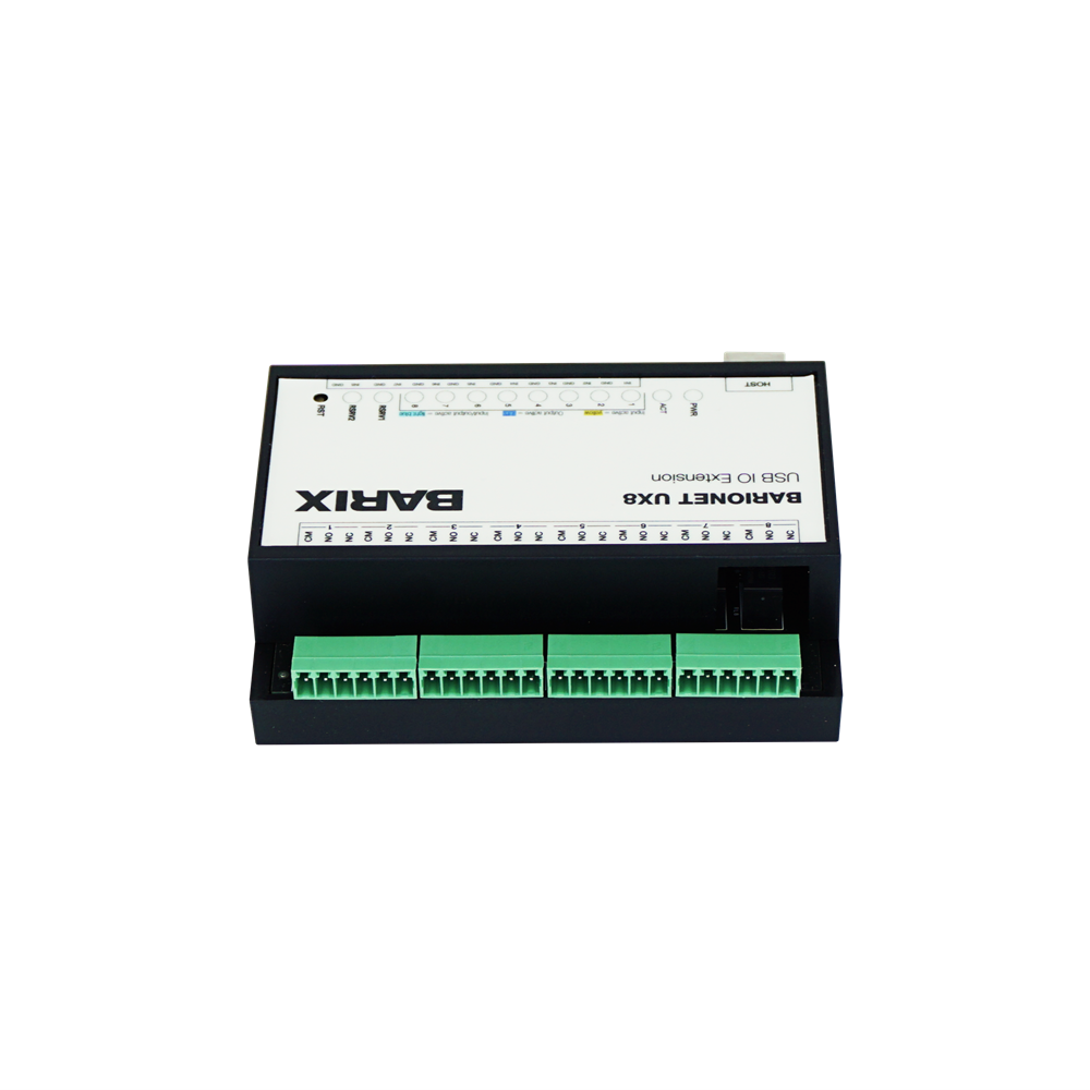 USB connected and powered IO Extension.The UX8 is a USB connected and powered IO Extension for IPAM based Barionet devices. It provides a simple way to increase the number of contact closures with 8x Dry Input Contact and 8x Relay outputs with NO and NC positions. The Barionet UX8 is immediately identified by the head-end Barionet device to which it is connected to and seamlessly extends its IO capabilities. The IOs provided by UX8 appear as part of the file system just like the built-in IOs of the head end Barionet unit. A Barionet head-end unit can support up to 2 UX8 extensions.