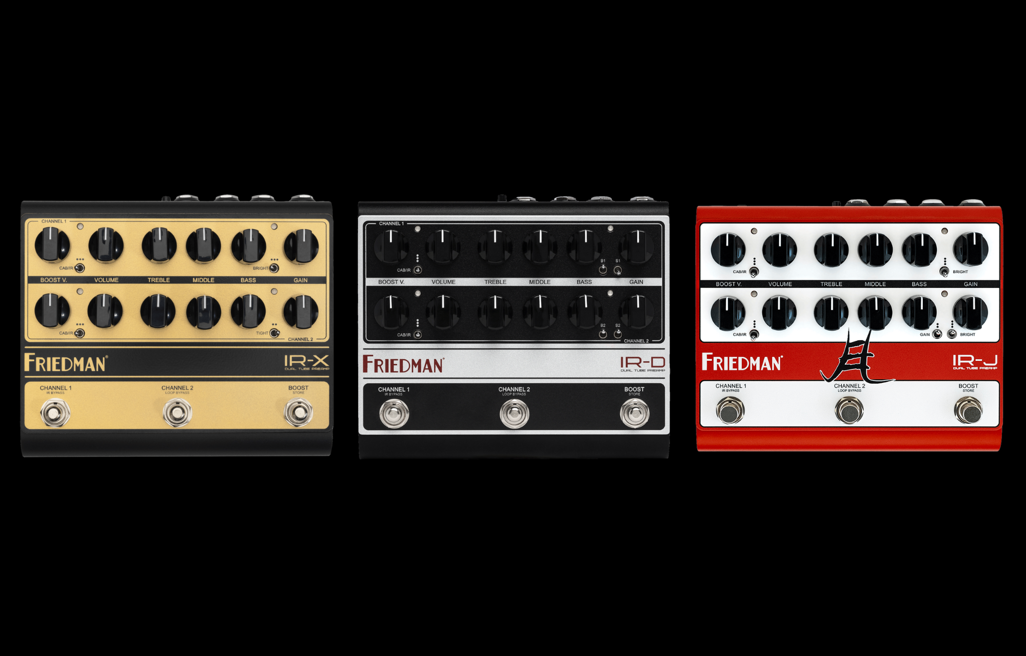 PEDALS Friedman IR-X | Friedman IR-D | Friedman IR-J The Friedman IR series—IR-X, IR-D, and IR-J—packs the full Friedman tube amp experience into compact, pedalboard-friendly preamp units. Each features two high-voltage 12AX7 tubes for the rich harmonics, touch sensitivity, and tone that define Dave Friedman’s amps. The IR-X delivers two versatile channels of Friedman’s signature overdrive, while the IR-D offers dual identical channels based on a modded JTM45 for classic British tones. The IR-J, Jake E Lee’s signature model, draws from the JEL-100 and JEL-20 with circuits rooted in modded Plexi and JCM800 designs. All three include DSP-based IR cabinet and power amp simulation, plus modern features like MIDI, FX loop, headphone jack, and editor software—ideal for both studio and live use.