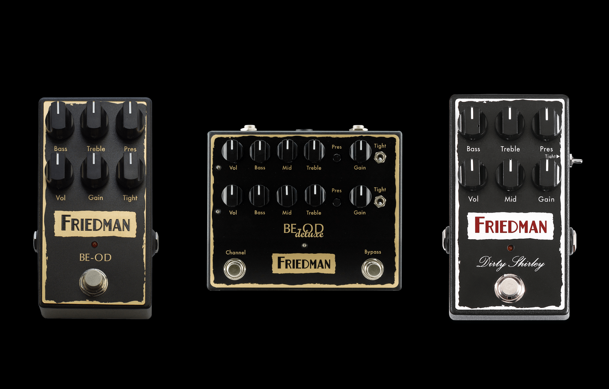 PEDALS Friedman BE-OD Deluxe | Friedman BE-OD | Friedman Dirty Shirley The Friedman BE-OD Deluxe, BE-OD, and Dirty Shirley pedals bring the unmistakable Friedman amp tones to your pedalboard. The BE-OD Deluxe features the same circuit as the original BE-OD but adds a second channel with dual midrange controls—Channel 1 replicates the original BE-OD’s high-gain tone, while Channel 2 offers a slightly lower-gain voicing, perfect for switching between rhythm and lead tones. The original BE-OD pedal captures the aggressive, harmonically rich tone of the iconic BE-100 amplifier, known for powering stages worldwide. Meanwhile, the Dirty Shirley pedal delivers vintage-inspired rock tones with its intuitive control set, faithfully mirroring the Dirty Shirley amp for a wide range of classic sounds.