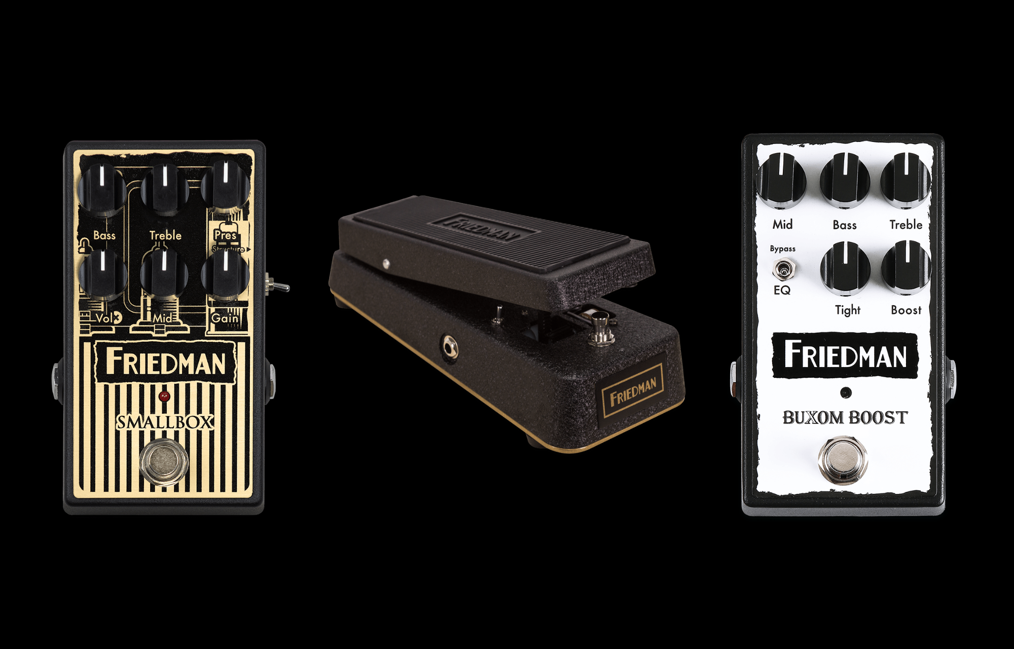 PEDALS Friedman Small Box OD | Friedman Buxom Boost | Friedman Gold 72 Wah The Friedman Small Box OD, Buxom Boost, and Gold-72 Wah pedals offer a versatile range of tone-shaping tools for any guitarist. The Small Box OD captures the front end of the SmallBox amp, delivering everything from vintage Plexi-style crunch to high-gain saturation with an intuitive control layout. The Buxom Boost provides a powerful, clean boost with a bypassable EQ section, designed to extract the most from your rig while preserving clarity and dynamics. Rounding out the lineup, the Gold-72 Wah—also known as the "No More Tears" Wah—offers classic wah tones with the added ability to fine-tune its sweep and response, giving you total control over its expressive character.