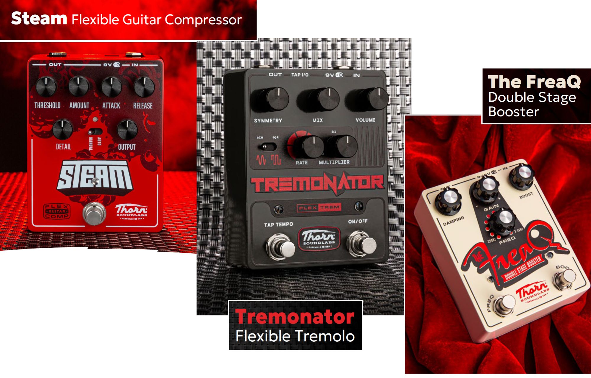 MODULATION and DYNAMIC EFFECTS STEAM | TREMONATOR | THE FREAQ The Tremonator – Flex Trem is a versatile tremolo pedal, with controls like Symmetry, Mix, Rate, and Multiplier, plus SIN/SQR waveform switching and Tap Tempo for precise rhythmic effects. The FreaQ – Double Stage Booster provides punchy, flexible boosts with Gain, Boost, Damping, and Freq controls, allowing subtle lifts or stage-ready tones with fine frequency shaping. The Steam – Flex Comp compressor gives dynamic precision through Threshold, Amount, Attack, Release, and Detail, with an Auto/Manual switch for either automatic or customized compression. Together, these pedals deliver expressive, professional-level tone and control.