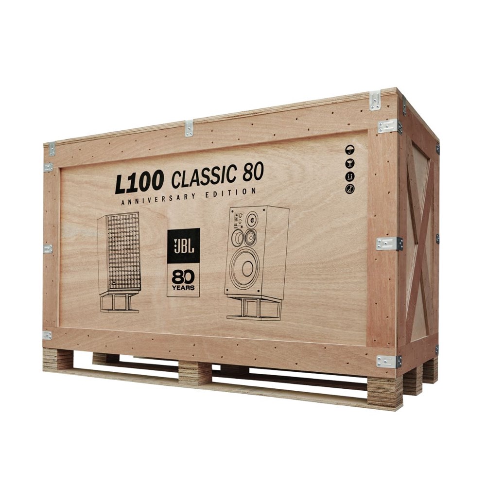 This Limited-Edition JBL L100 Classic loudspeaker package commemorates JBL's 80 years of excellence in audio. The L100 Classic 80 showcases a stunning oak wood veneer enclosure, paired with a brown Quadrex foam grille that features a gold and black JBL logo, all framed in sleek black satin wood. Each speaker is adorned with anniversary edition badges on both the front and back, including a unique numbered plaque signed by principal system engineer Chris Hagen, indicating its place in the limited production run. Sold as a matched pair, the L100 Classic 80 comes with a set of JS-150 floor stands and is delivered in a specially designed wooden crate. With only 800 pairs available globally, this edition is truly a collector's item.