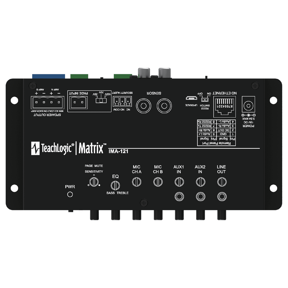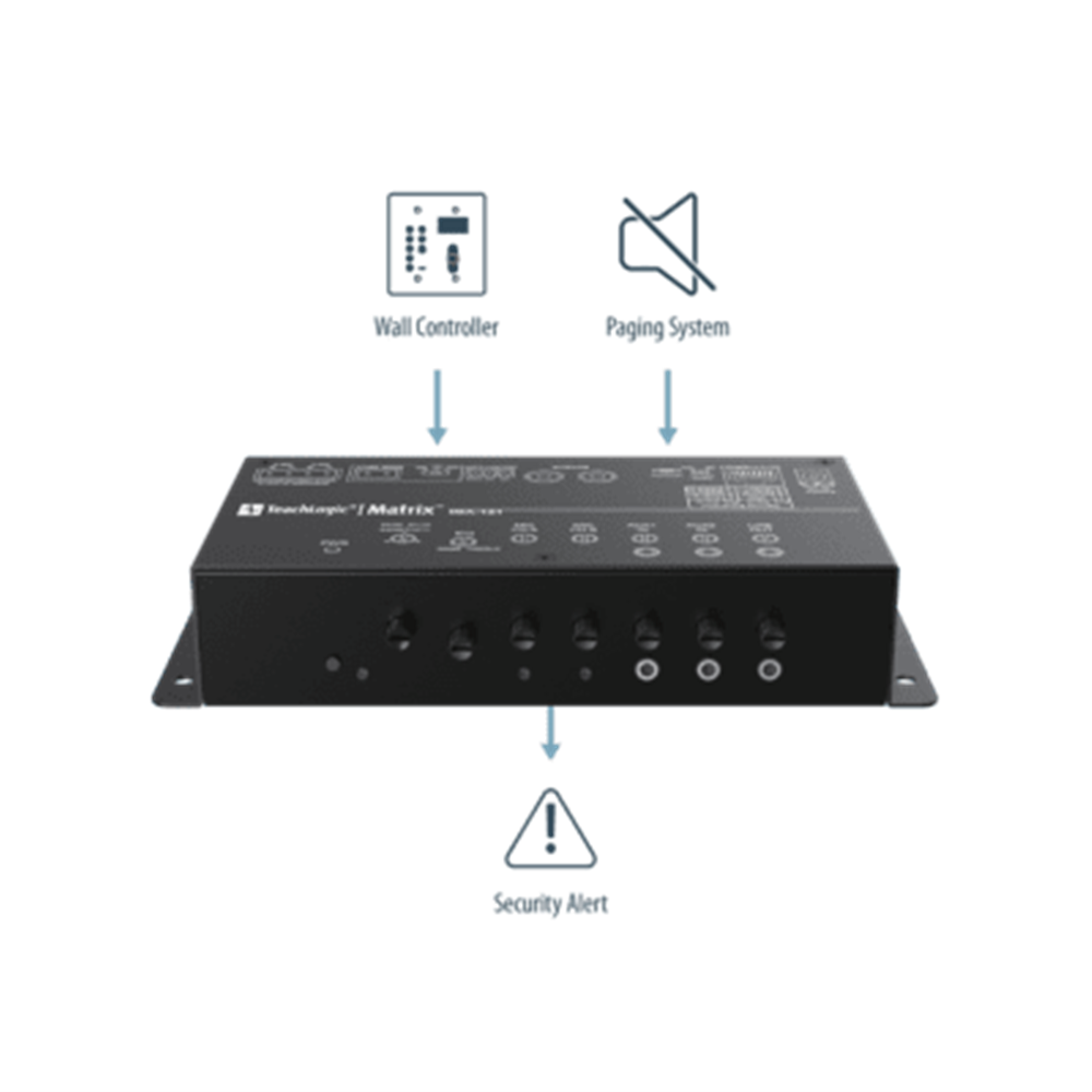 With a simple CAT-5 cable, the TeachLogic CPS-121 (or CPR-125) wall controller manages the audio sources and volume levels so that the amplifier can be installed somewhere secure.