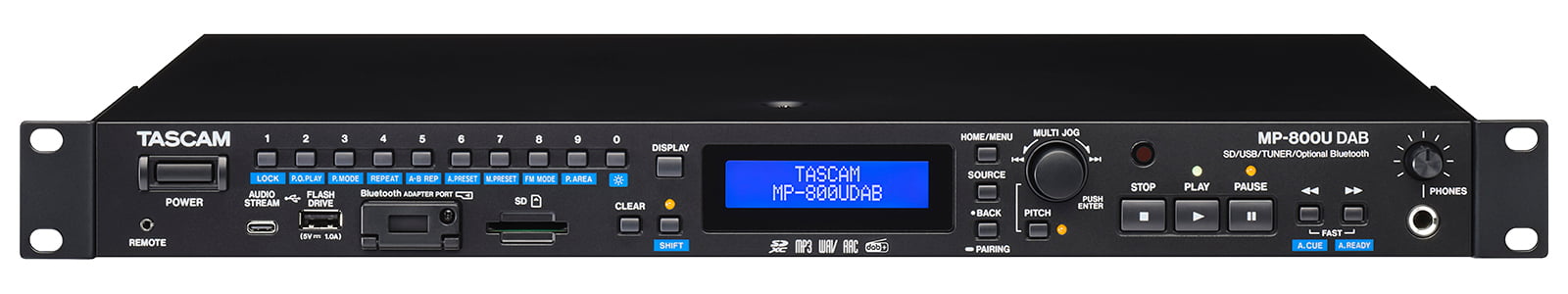 The MP-800U DAB offers multi-format playback via its front-panel SD card slot and USB flash drive port. Compatible file types include WAV, MP3, and AAC.