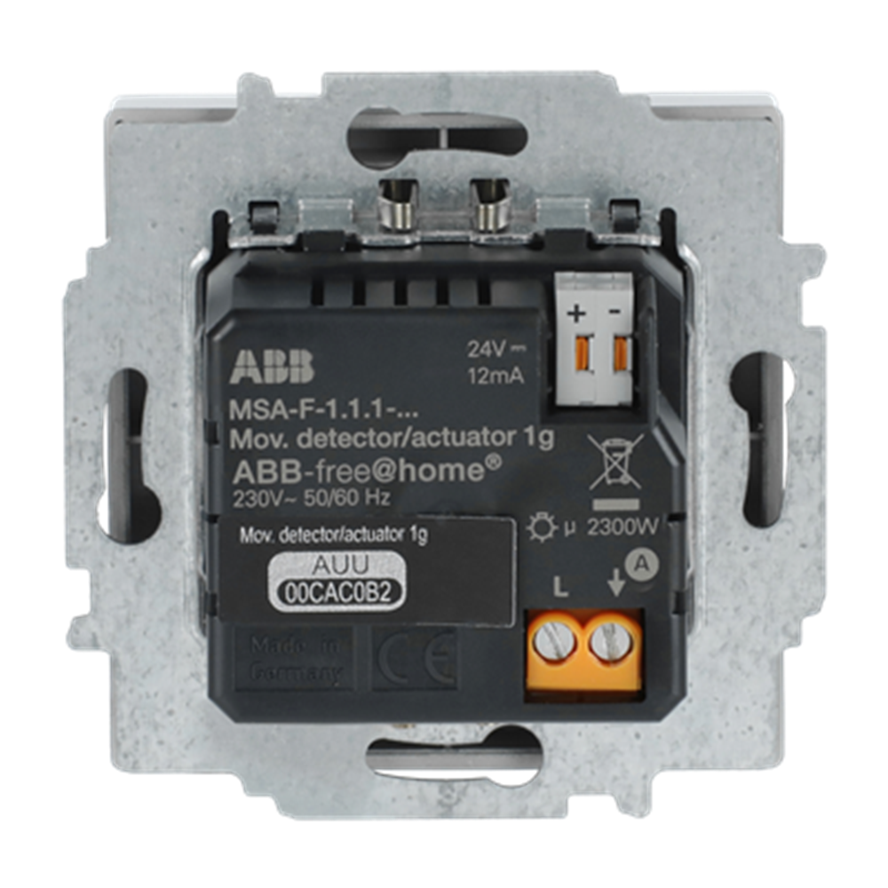 With select lens for detection with animal access. For automatic switching of ABB-free@home® actuators dependent on movement and brightness. Switch-off delay of the actuator can be programmed via the web interface of the System Access Point. For switching 127 V~/230 V~ consumers. With integrated switch actuator. Switching function is available also without prior programming (pre-configured). Configuration can be changed later via the web interface (groups, scenes, etc.). The bus can be connected via enclosed terminal block. When installing in the flush-mounted box, a spatial division between the bus cable and 127 V/230 V installation cable is to be adhered to! If this minimum distance is not possible, use electronic boxes or insulating tubes.