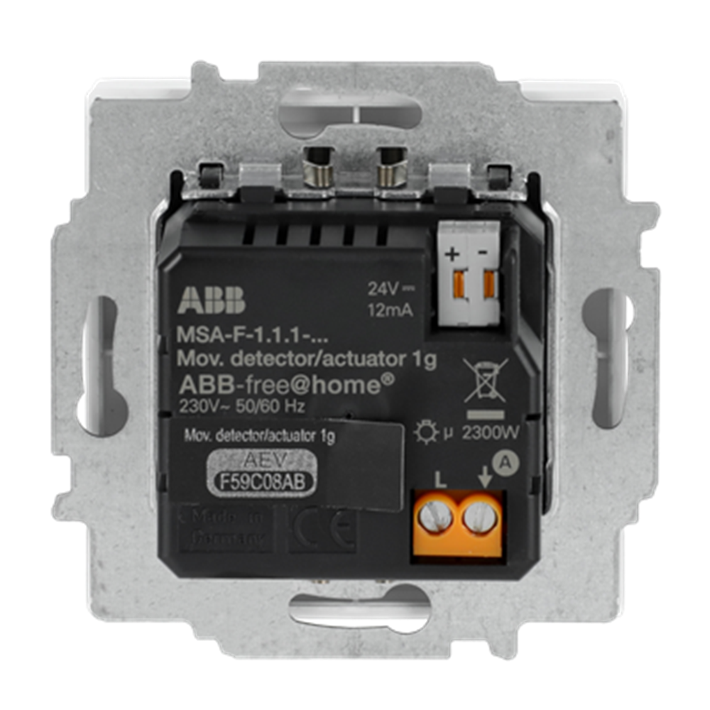 With select lens for detection with animal access. For automatic switching of ABB-free@home® actuators dependent on movement and brightness. Switch-off delay of the actuator can be programmed via the web interface of the System Access Point. For switching 127 V~/230 V~ consumers. With integrated switch actuator. Switching function is available also without prior programming (pre-configured). Configuration can be changed later via the web interface (groups, scenes, etc.). The bus can be connected via enclosed terminal block. When installing in the flush-mounted box, a spatial division between the bus cable and 127 V/230 V installation cable is to be adhered to! If this minimum distance is not possible, use electronic boxes or insulating tubes.