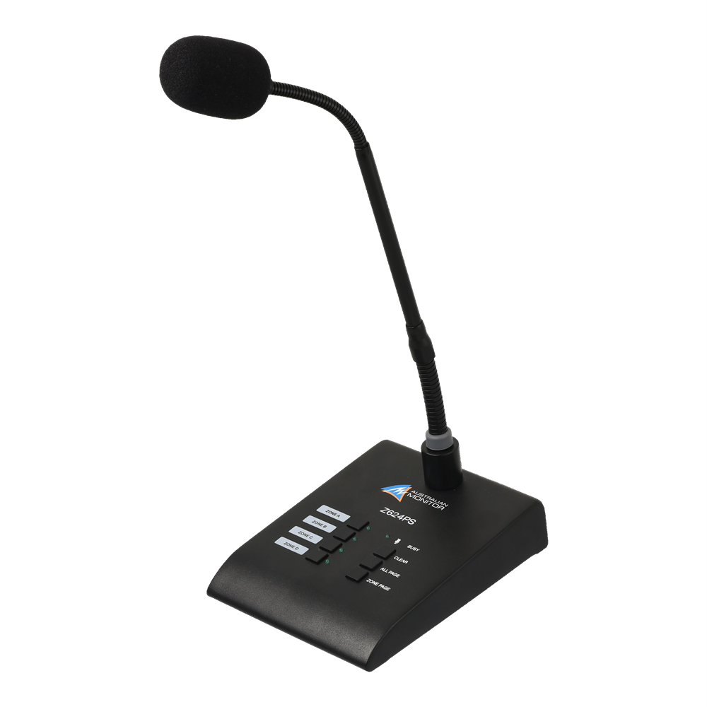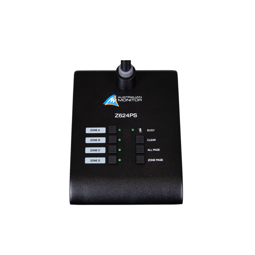 The Z624PS paging station is a paging front end for the Z624 system. Featuring a slimline gooseneck paging microphone and the ability to page any single zone, combination of zones or All Call.