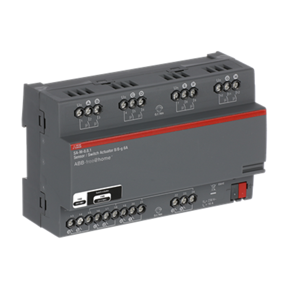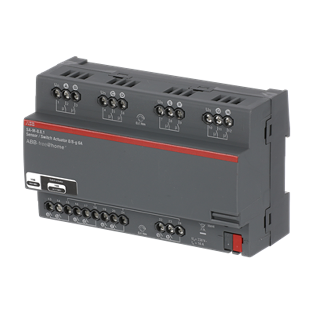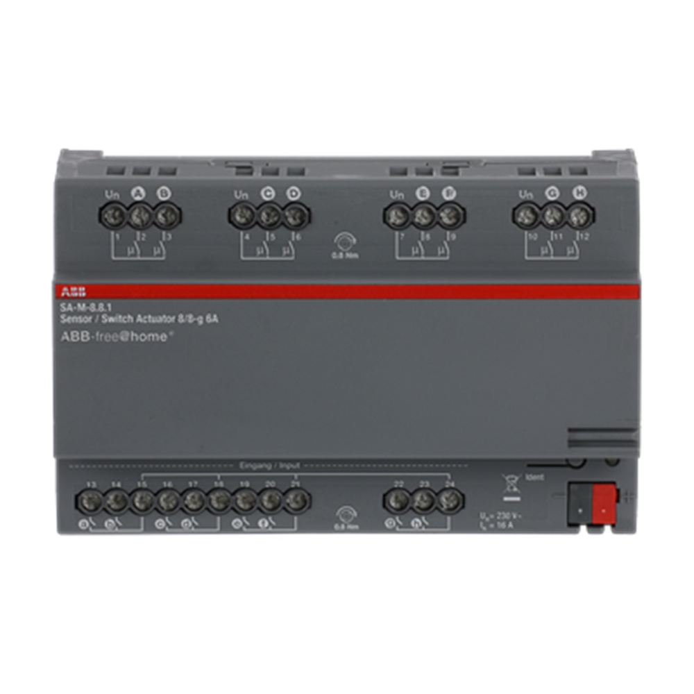 Combination device with 8 binary inputs and 8 switch actuators. Conventional push-buttons or auxiliary contacts can be connected to 8 channels.The information of the contact enquiry can be used for activating ABB-free@home® actuators or for recording status information. The contact polling voltage is made available by the device itself.