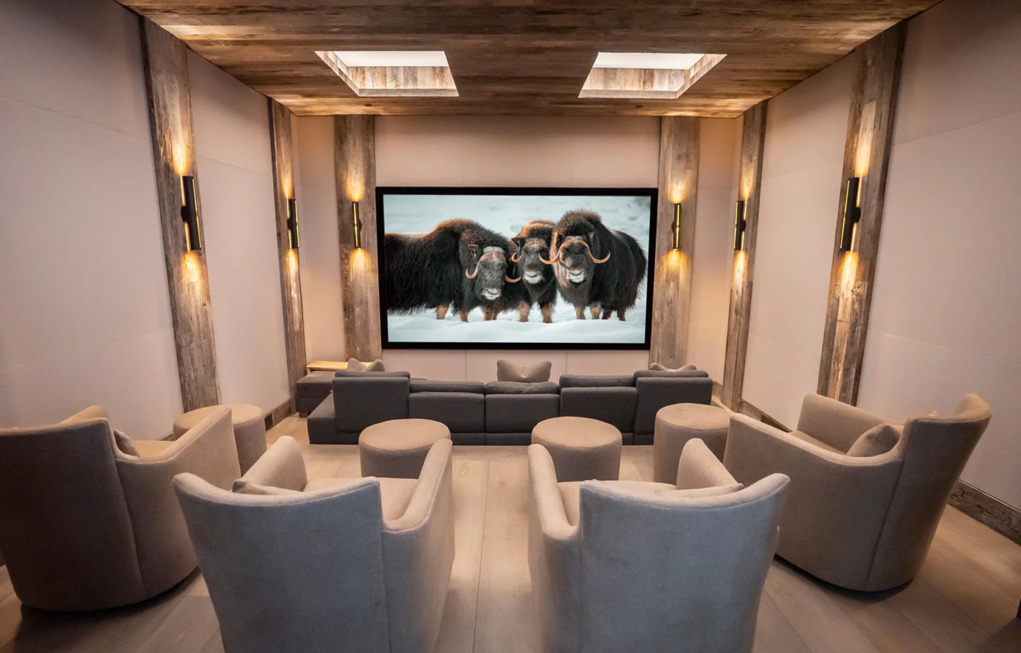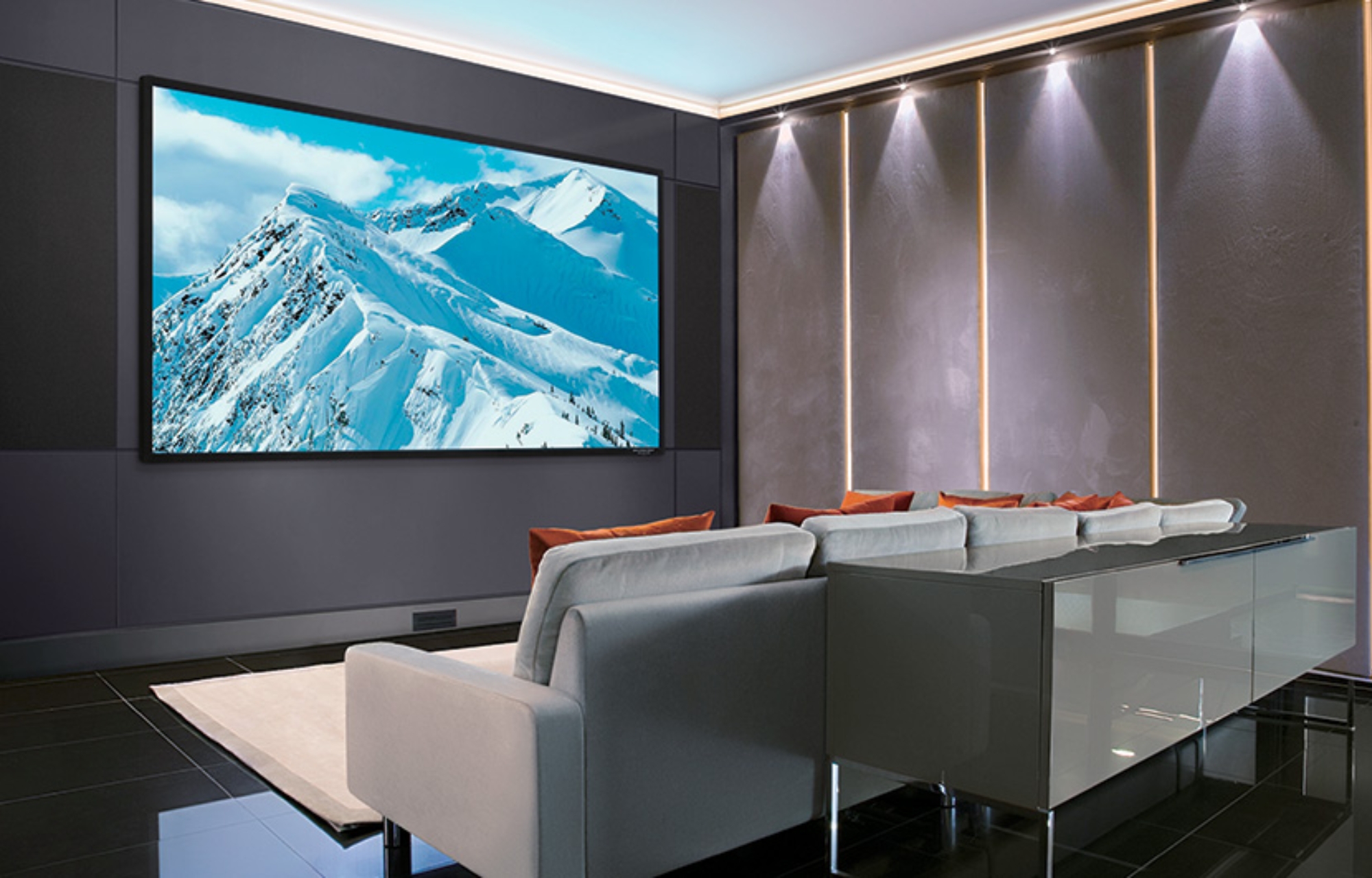 Fixed-frame and motorised projection screens enhance image quality across dedicated theatres and multi-purpose living spaces.