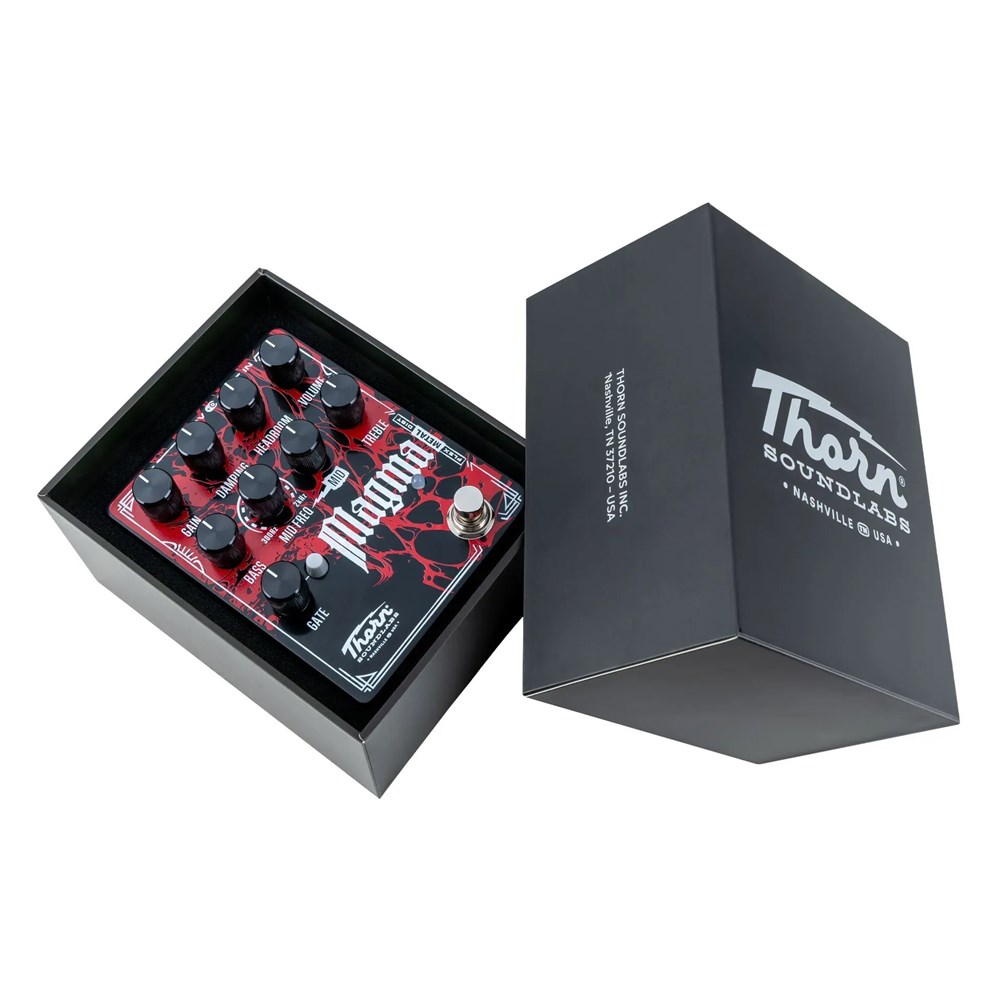 The Thorn Magma - Flex Metal Dist is a versatile and powerful metal distortion pedal, specifically designed to meet the needs of modern heavy guitar tones. Equipped with a built-in Noise Gate, this pedal allows you to achieve tight, high-gain sounds while minimizing unwanted noise and feedback. The Gain, Damping, Headroom, and Volume controls provide complete command over your distortion, enabling you to shape everything from subtle grit to full-on, aggressive metal tones. The Bass, Mid Freq, Mid, and Treble controls offer precise tonal shaping, while the Gate control ensures a clean and tight signal even at high distortion levels. The Thorn Magma - Flex Metal Dist is the ideal tool for delivering intense, cutting metal distortion with unparalleled flexibility and noise control.