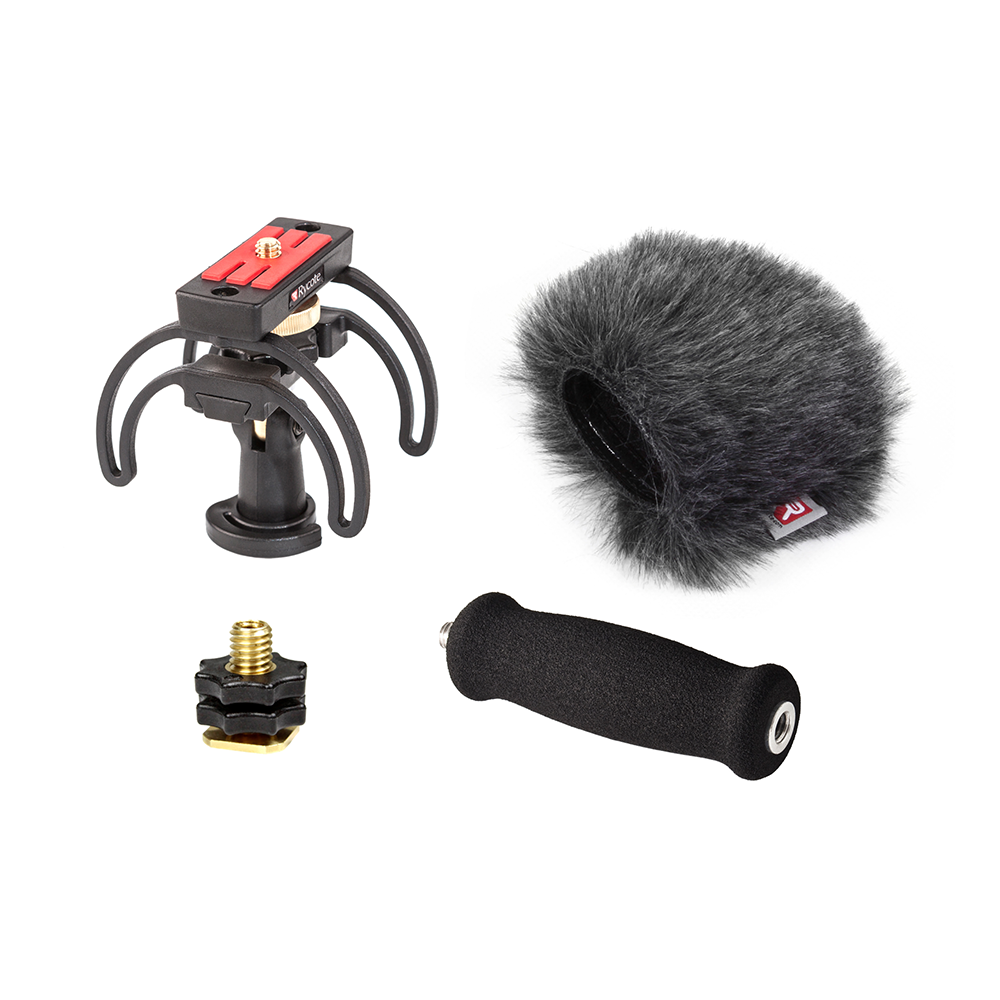 A combined Windshield and Suspension solution, the kit contains everything needed to protect a handheld digital recorder from outdoor wind noise, and also to isolate it from unwanted vibrations, whether from handling or stand-borne noise. It can be used for location soundtracks or outside broadcast, or for simple audio podcasts or outdoor radio reporting.