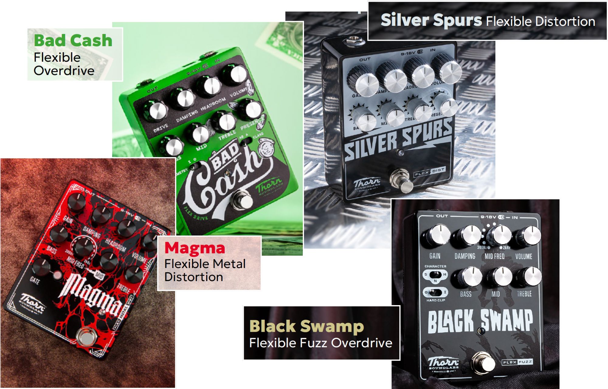 GAIN and DISTORTION PEDALS SILVER SPURS | BAD CASH | MAGMA | BLACK SWAMP Thorn Soundlabs’ Flex series offers four pedals designed for maximum tonal control. The Silver Spurs – Flex Dist delivers versatile distortion from smooth overdrive to high-gain aggression with full EQ and gain controls. The Bad Cash – Flex Drive provides adaptable overdrive with Drive, Damping, Headroom, and circuit-switch options for varied tonal textures. The Magma – Flex Metal Dist targets modern metal tones, combining high-gain distortion, a built-in Noise Gate, and comprehensive EQ for tight, aggressive riffs. The Black Swamp – Flex Fuzz offers rich fuzz tones with full EQ, Character, and Hard Clip switches, covering sounds from warm and smooth to raw and intense. Together, these pedals give guitarists flexible, precise control over their sound.