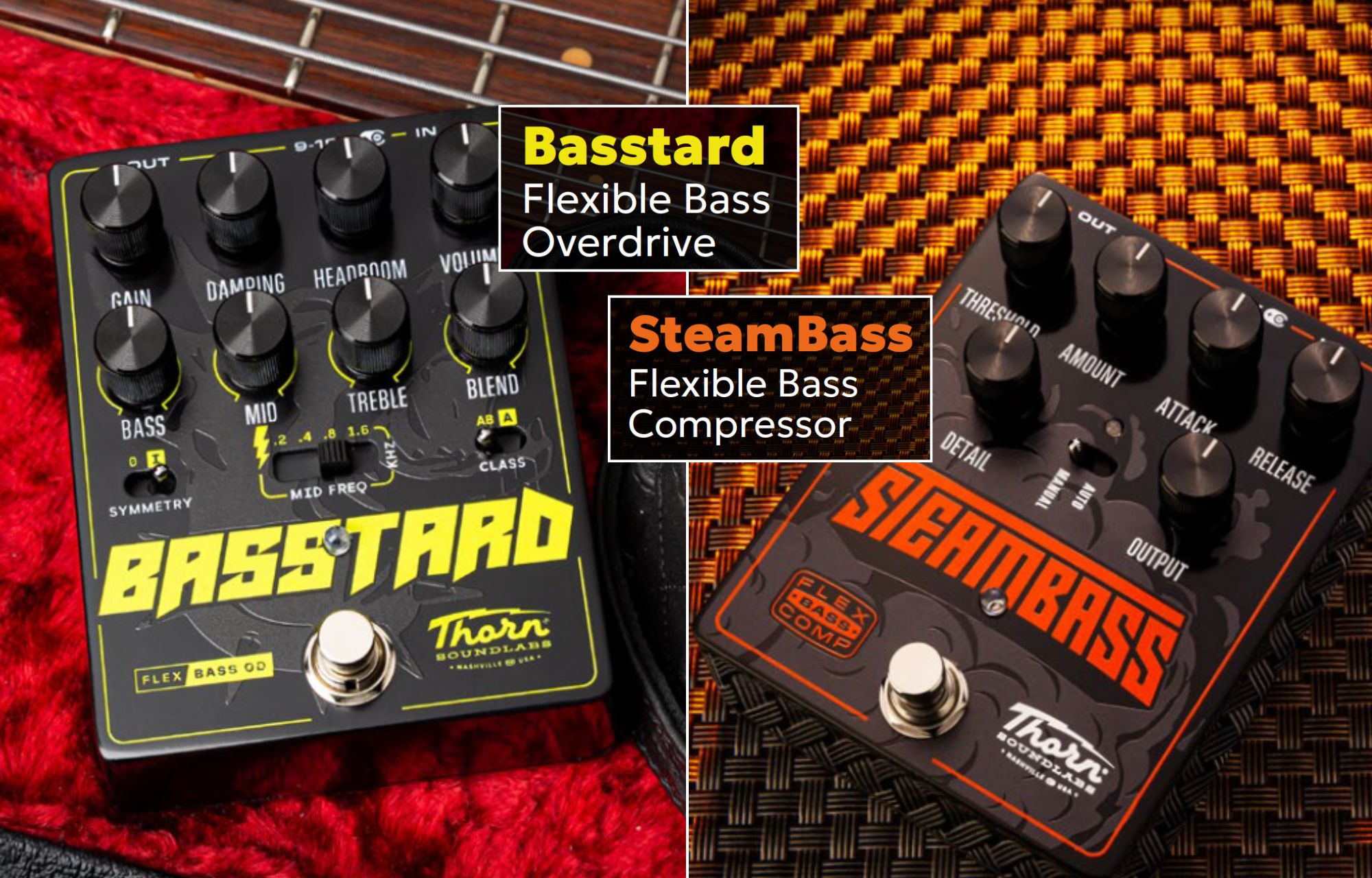 EFFECTS FOR BASS BASSTARD | STEAMBASS Thorn Soundlabs also offers two powerful tools for bass players. The Basstard – Flex Bass Overdrive provides versatile overdrive with controls for Gain, Damping, Headroom, Volume, and a parametric Bass, Mid, and Treble section, plus a Blend knob to balance clean and overdriven signals. Additional switches, including Symmetry, Mid Freq, and Class A/AB, let players fine-tune distortion character and tonal behavior, from subtle warmth to bold grit. The Steambass – Flex Bass Comp is a flexible compressor that shapes dynamics with Threshold, Amount, Attack, Release, Detail, and Output controls, while its Auto/Manual switch allows for either automatic or custom timing. Together, these pedals give bassists precise control, dynamic punch, and expressive tonal versatility.