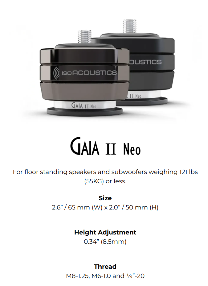 The GAIA Neo series represents the latest advancement in IsoAcoustics’ acclaimed line of speaker isolation feet. Building on the success of the original GAIA models, the Neo version features several enhancements, such as effortless height adjustment, superior isolation capabilities, easier installation, and a stylish modern design available in black or dark chrome.